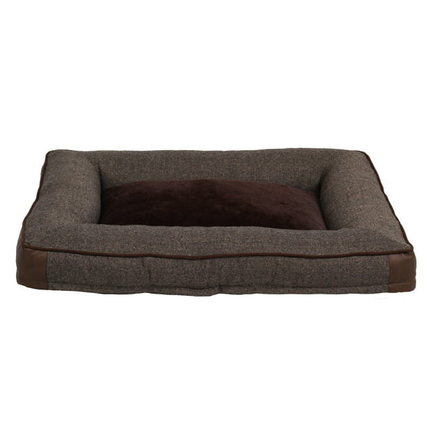 Designed for the fashionable and trendy dog, this Brown Rectangle Bolster Bed from offers comfort and softness for larger dogs that love to curl up. The bed features a shredded foam sleep center with a cushy fabric center, complemented by a sophisticated solid fabric with trim. Faux leather handles add a touch of luxury, making this bed fit for a king or queen. The soft poly-fiber filled bolsters around the edges provide a perfect headrest for better sleep. Whether it's a larger dog or a smaller dog that prefers more space, the Rectangle Bolster Bed will become their new favorite spot to hang out. The machine washable cover ensures easy care and maintenance.