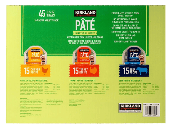 The Kirkland Signature Pâté Wet Dog Food Variety Pack is specially formulated to meet the nutritional needs of small breed adult dogs. Each tray contains 3.5 ounces of moist, flavorful pâté made with real chicken, turkey, or beef as the primary ingredient. This variety pack includes 45 individual trays—15 each of chicken, turkey, and beef recipes—providing a balanced diet and variety to keep your dog satisfied.
